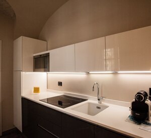 The Apartment Suite Luxury can accommodate maximum of 4 people, and it has a master bedroom, one single bed (separated from the master bedroom), and a possibility of adding another single bed.